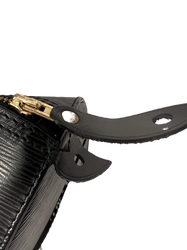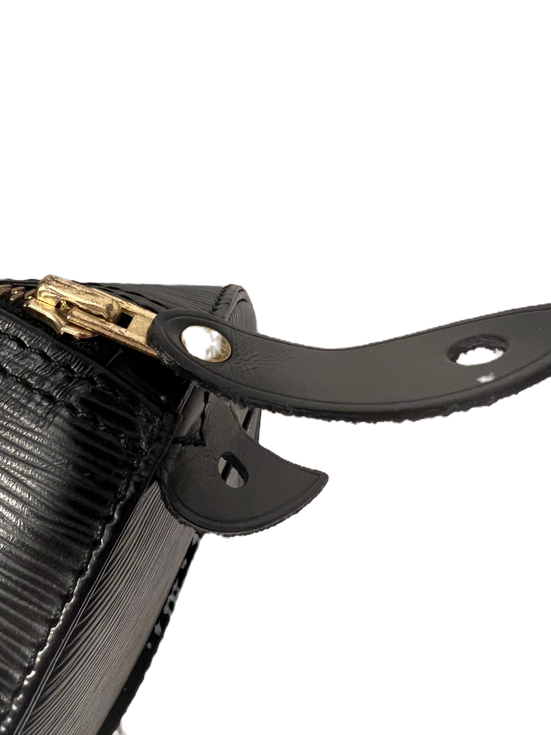This Louis Vuitton bag boasts an elegant brushed black leather outside, complemented by the iconic LV monogram in a discreet light grey in the bottom right and elegantly contrasted by the bronze colours of the zipper and other metal straps and buttons.